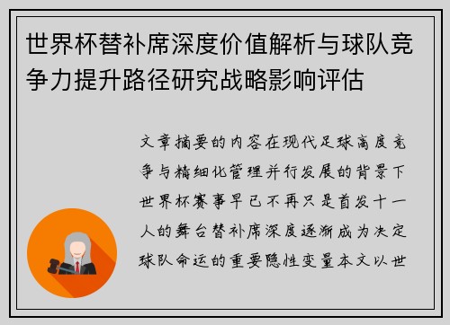 阅读文章摘要的内容世界杯作为全球足球最高殿堂,每一场比赛都牵动着亿万球迷的神经。在星光熠熠的赛场上,胜负往往并非只取决于首发阵容的豪华程度,而是在瞬息万变的比赛进程中,由主教练做出的关键抉择所左右。其中,...